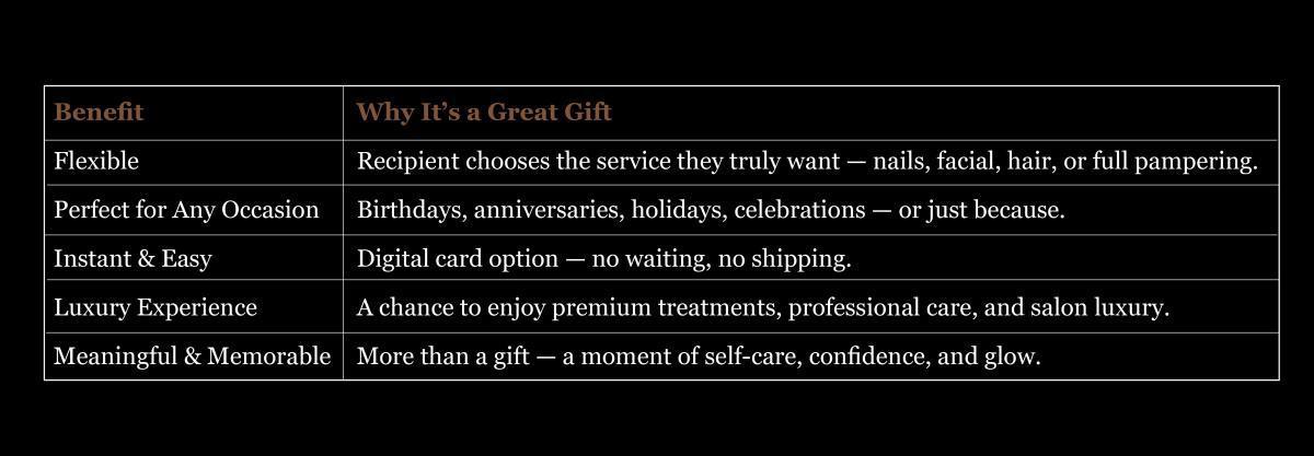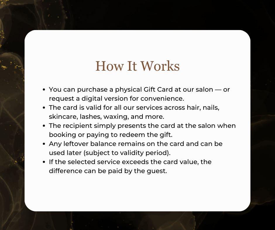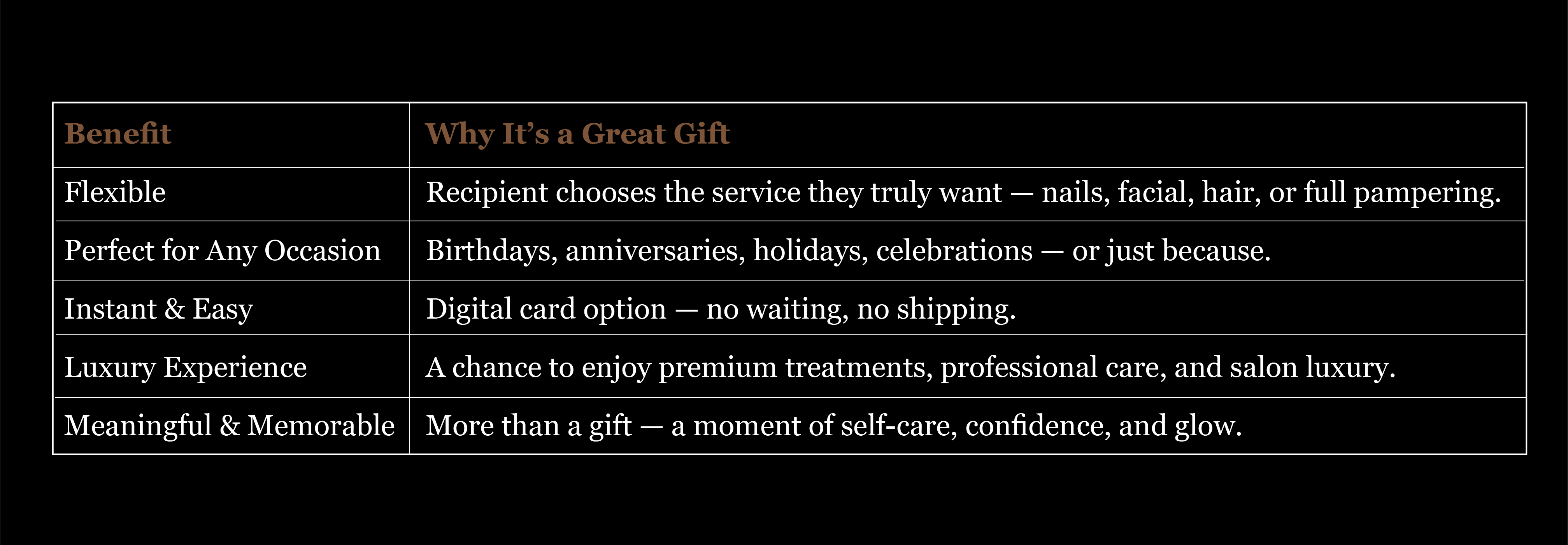 Looking to spoil someone special with a pampering treat? Our Taif Beauty Salon Gift Card is the ideal present. Whether you choose to surprise a friend, a family member, or a loved one — with a Gift Card from Taif Beauty Salon, you give them the freedom to pick what they love: nails, hair, facials, waxing, lashes, or full-service packages. A gift of beauty that shows care, indulgence, and elegance.